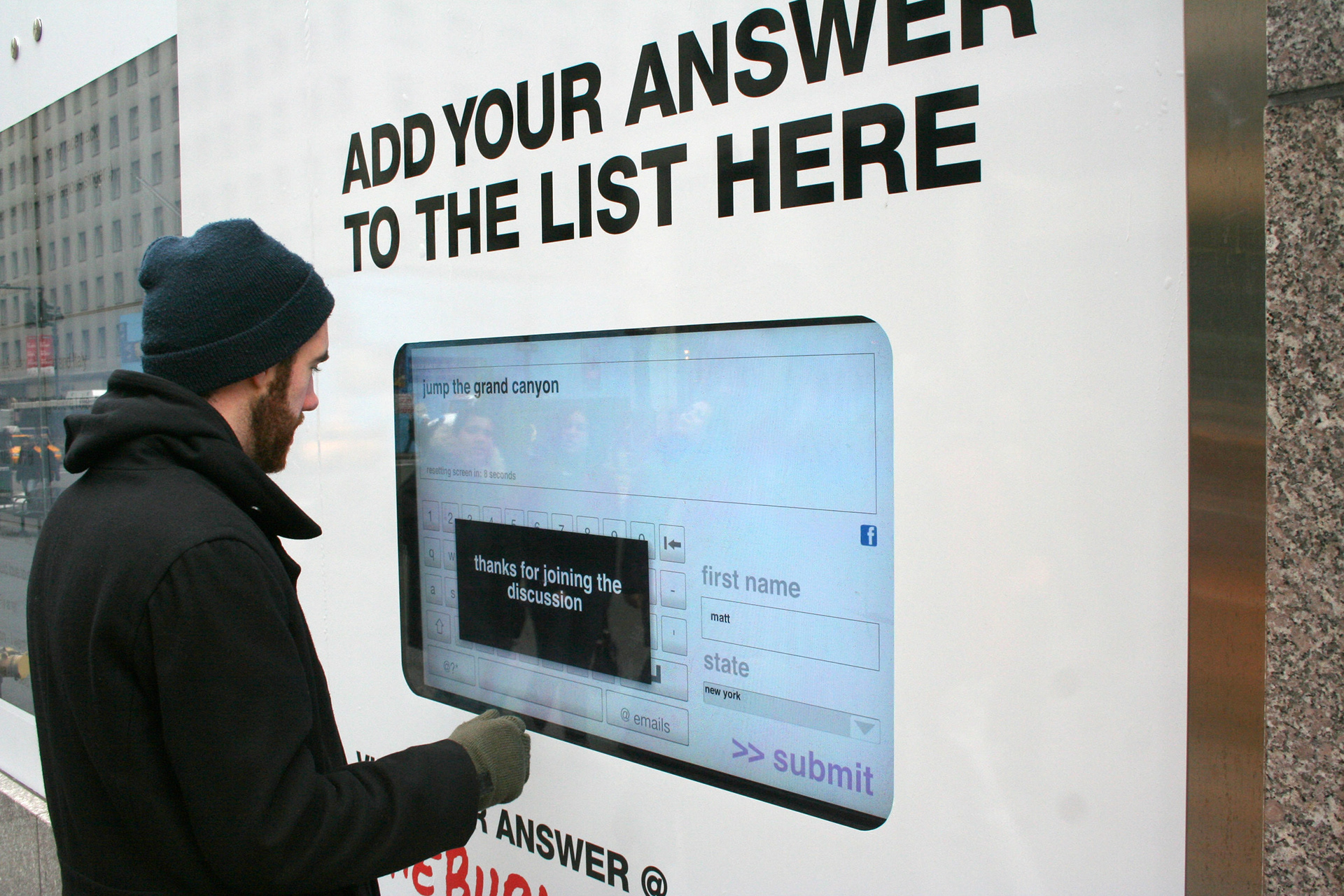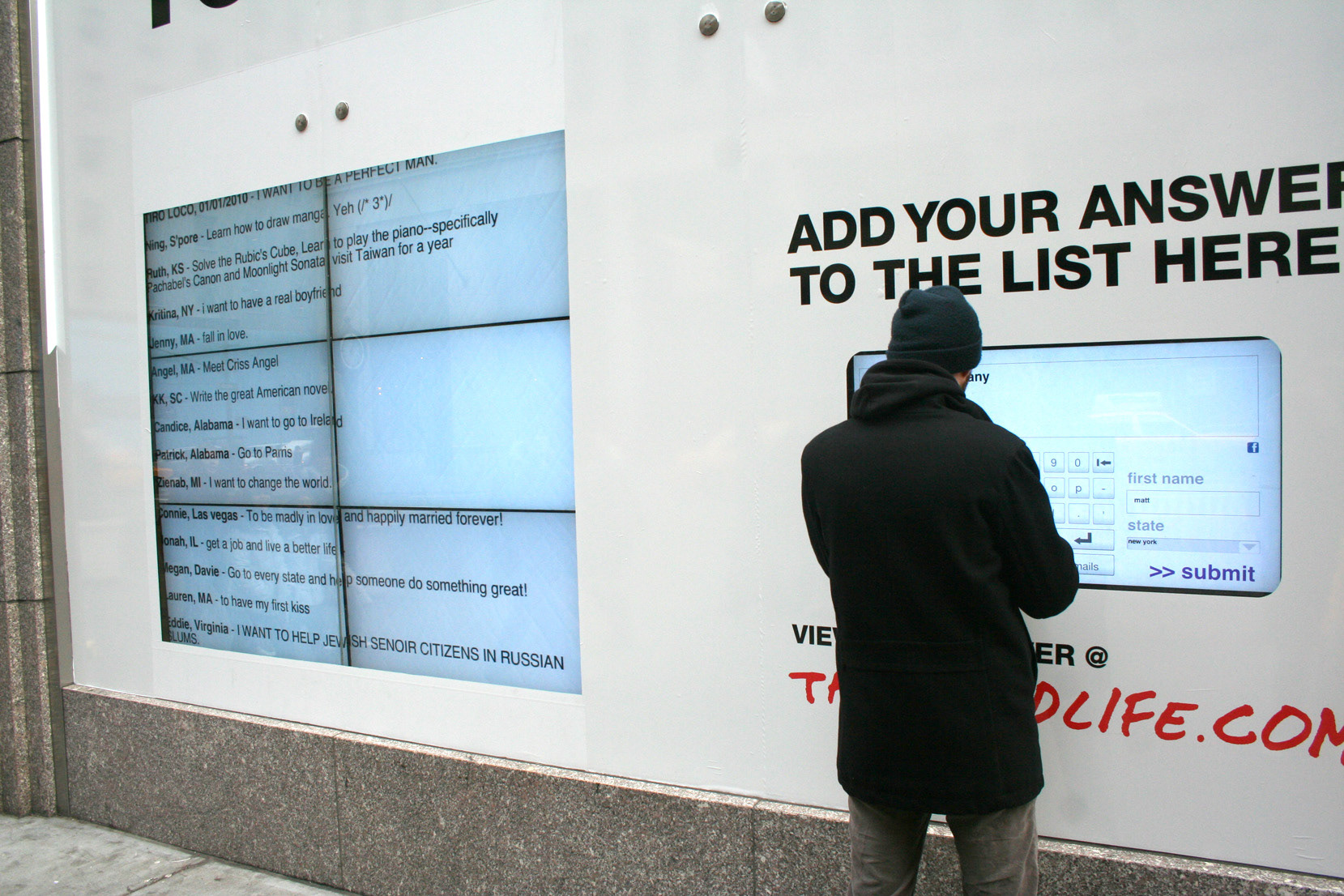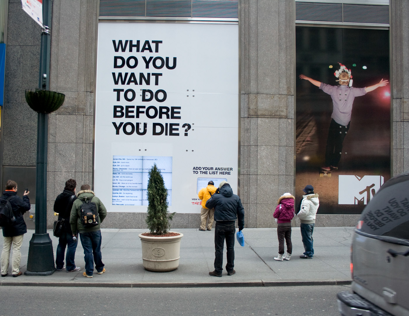 We created an interactive storefront on the corner of New York’s Fifth Avenue and 43rd Street printed with promotional shots from the show and the show’s question; "what do you want to do before you die". Touchscreen interfaces let users watch clips from the show and enter their own answer, which they could then post in their Facebook newsfeed. All user submissions were synced across banner ads, onto the show’s homepage and in a scrolling list at the storefront.